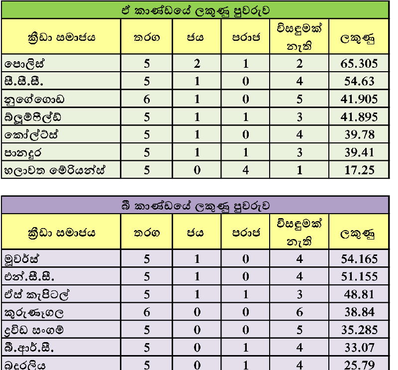 හයවැනි සතියේදී බ්ලූම්ෆීල්ඩ් කණ්ඩායම හමුවේ පරාජයට පත්වුවද, පොලිස් කණ්ඩායම තවදුරටත් ‘ඒ’ කාණ්ඩයේ පෙරමුණ රැකගැනීමට සමත්ව සිටින්නේ ලකුණු 65.305 කට හිමිකම් කියමිනි. පානදුර කණ්ඩායමට එරෙහිව මුල් ඉනිමේ ජයක් ලැබූ සී.සී.සී. කණ්ඩායම මේ වන විට ලකුණු 54.63 ක් ලබා ‘ඒ’ කාණ්ඩයේ දෙවැනි ස්ථානයේ රැදී සිටියි.