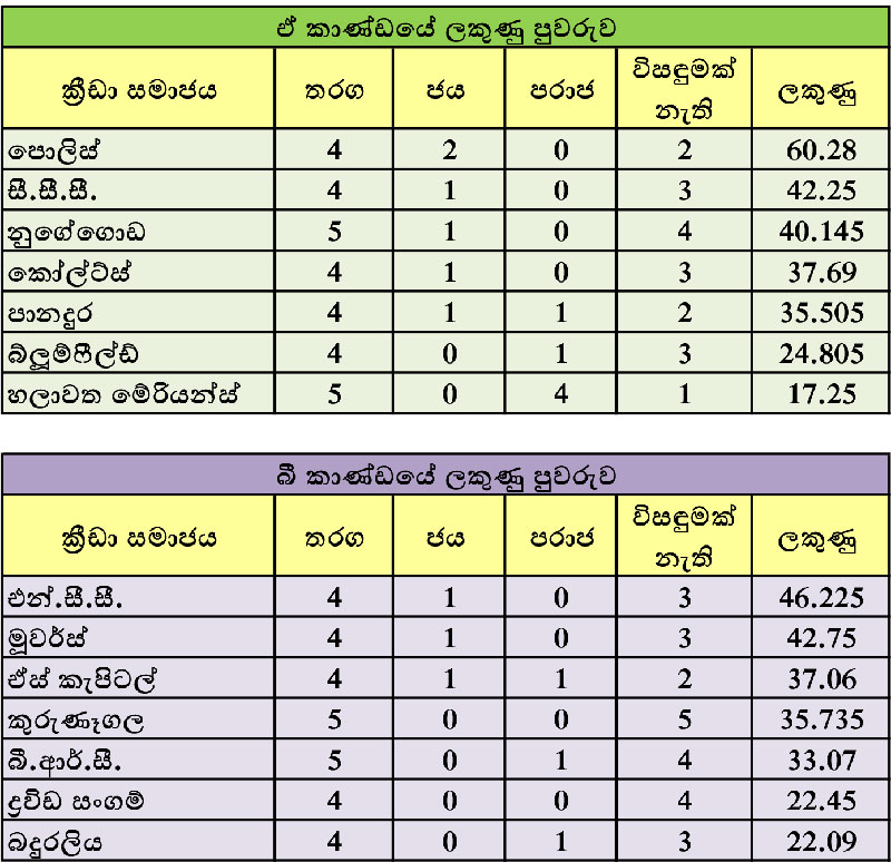 පස්වැනි සතියේදී හලාවත මේරියන්ස් කණ්ඩායමට එරෙහිව පූර්ණ ජයක් ලැබූ සී.සී.සී. කණ්ඩායම ලකුණු 42.25 ක් ලබා ‘ඒ’ කාණ්ඩයේ දෙවැනි ස්ථානයේ රැදී සිටියි. සිවුවැනි සතියේදී ඒස් කැපිටල් කණ්ඩායමට එරෙහිව පූර්ණ ජයක් ලැබූ, මුවර්ස් කණ්ඩායම පස්වැනි සතියේදී විවේකයක් ලබා සිටියද ලකුණු 42.75 කට හිමිකම් කියමින් ‘බී.’ කාණ්ඩයේ දෙවැනි ස්ථානයට පත්ව තිබේ.