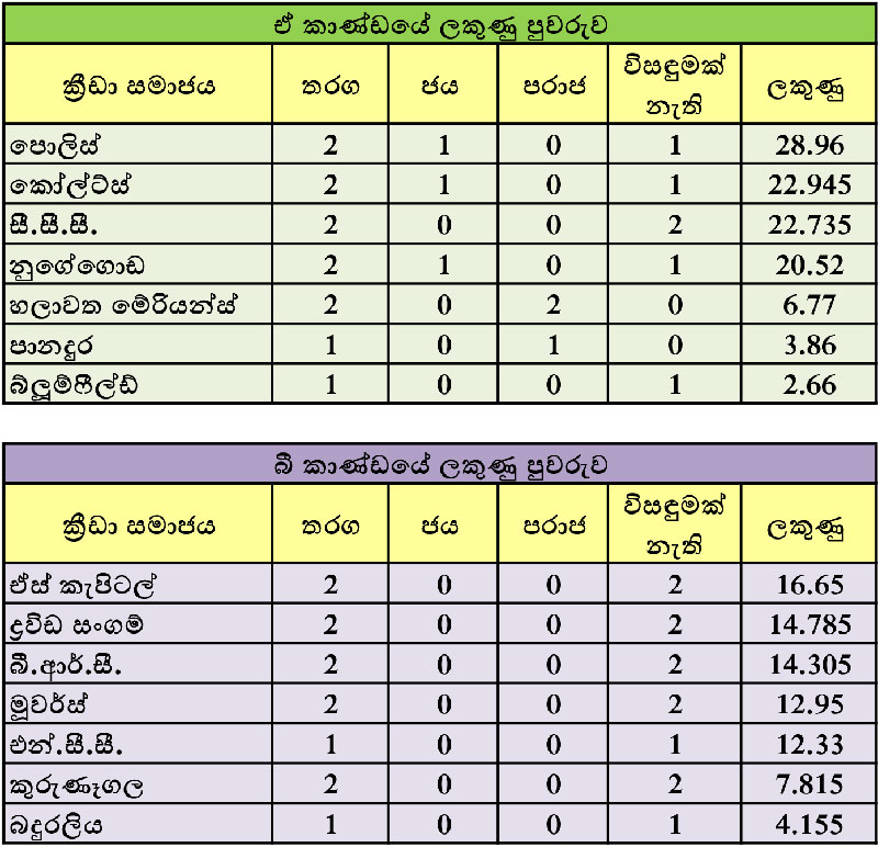 පළමු සතියේදී පානදුර කණ්ඩායමට එරෙහිව පූර්ණ ජයක් වාර්තා කළ පොලිස් ක්රීඩකයෝ දෙවැනි සතියේදී කෝල්ට්ස් කණ්ඩායමට එරෙහිව පළමු ඉනිමේ ජයක් වාර්තා කරමින් ‘ඒ’ කාණ්ඩයේ පෙරමුණට පැමිණියහ. ඒ එතෙක් ‘ඒ’ කාණ්ඩයේ පෙරමුණ ගෙන සිටි කෝල්ට්ස් කණ්ඩායම එහි දෙවැනි ස්ථානයට ඇද දමමිනි.