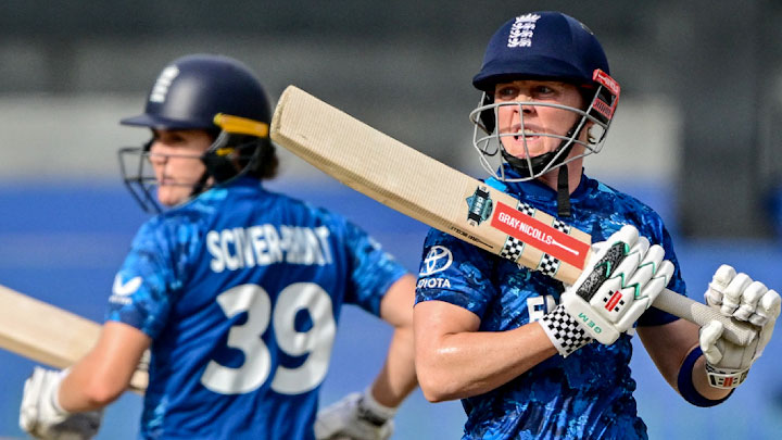 (ටැමී බියුමන්ට් 22, ඇමී ජෝන්ස් 56, හෙදර් නයිට් 109, නැතලි ෂිවර්-බ්රන්ට් 38, සොෆියා ඩන්ක්ලි 15, එමා ලෑම්බ් 11, චාලි ඩීන් නොදැවී 19, දීප්ති ෂර්මා 51/4, ශ්රී චරණි 68/2)
