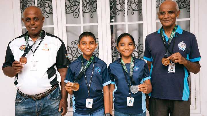 ජූඩ් සිරිවර්ධන, මන්තුල කුලතිලක, මන්තුලී කුලතිලක සහ කොල්වින් පෙරේරා දිනාගත් පදක්කම් ද සමගින් ඡායාරූපයකට පෙනී සිටි අයුරු