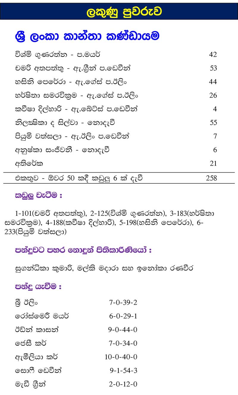 තම 20 වැනි එක්දින අර්ධ ශතකය ලබාගත් නායිකා චමරි අතපත්තු (53), විශ්මි ගුණරත්න (42), හසිනි පෙරේරා (44) සහ නිලක්ෂිකා ශ්රී ලංකා කාන්තාවන්ගේ ලකුණු පුවරුව වෙනුවෙන් වැඩි දායකත්වයක් දැක්වූහ.