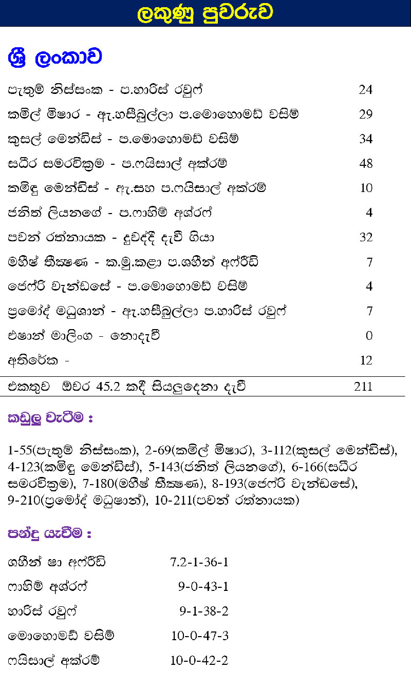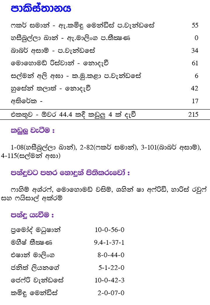 පළමුවෙන් පන්දුවට පහර දුන් ශ්රී ලංකා කණ්ඩායමට ලබාගත හැකිවූයේ ලකුණු 211 කි. ඕවර 45.2 කදී ශ්රී ලංකා කණ්ඩායම සම්පූර්ණයෙන්ම දැවී ගියේය. පාකිස්තානු කණ්ඩායම කඩුලු 4 ක් දැවී ලකුණු 215 ක් ලබාගත්තේ ඕවර 5.2 ක් ඉතිරිව තිබියදී ජයටැඹ පසුකර යමිනි.
