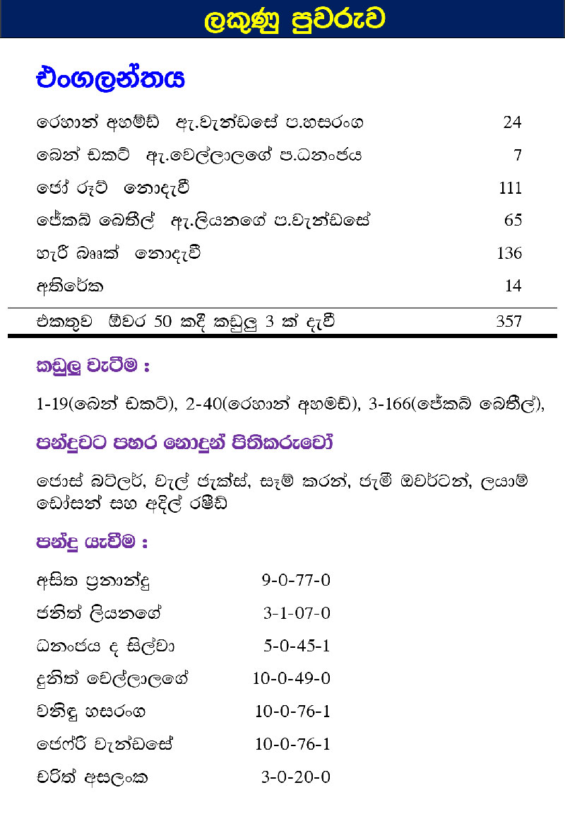 පළමු එක්දින තරගය අවසානයේදී “තුච්චම තණතීරුවක්” යයි හැරී බෲක්ගේ දරුණු විවේචනයට ලක්වූ ආර්. ප්රේමදාස ක්රීඩාංගණයේදීම අද (27 වැනිදා) පැවැති තුන්වැනි එක්දින තරගයේදී එංගලන්තය කඩුලු 3 ක් පමණක් දැවී ලකුණු 357 ක් ලබාගත්තේය. ජෝ රූට් පන්දු 108 කින් නොදැවී ලකුණු 111 ක් ලබාගනිද්දී හැරී බෲක් පන්දු 57 කින් සිය ශතකය ලබාගත්තේය.