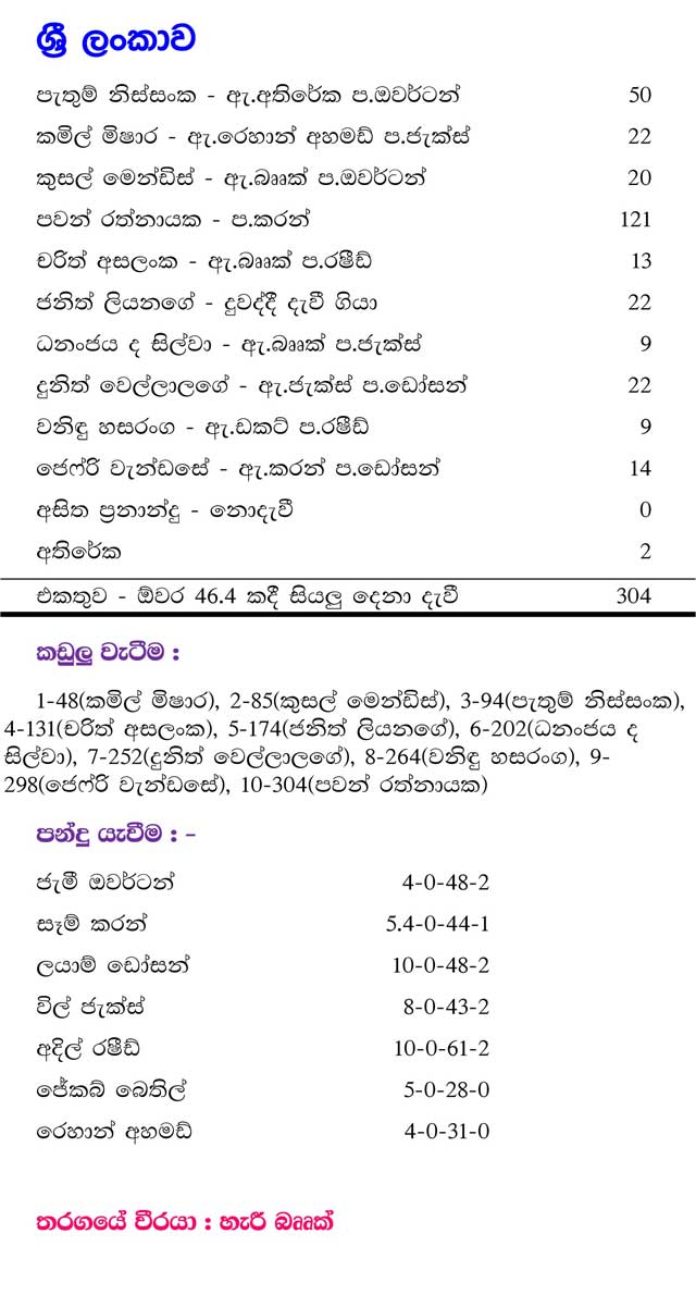 ප්රතිඵලය වූයේ ශ්රී ලාංකික දඟ පන්දු යවන්නන් හමුවේ අනුකම්පා විරහිත පිතිහරඹයක නිරත වූ හැරී බෲක්ගේ පිරිවර ඕවර 50 කින් ලකුණු 357 ක් උදුරා ගැනීමයි. එංගලන්ත නායකයා සිය ඉනිම නිමා කළේ අසිත ප්රනාන්දු යැවූ අවසන් පන්දුව නරඹන්නන් අතරට යවමිනි.