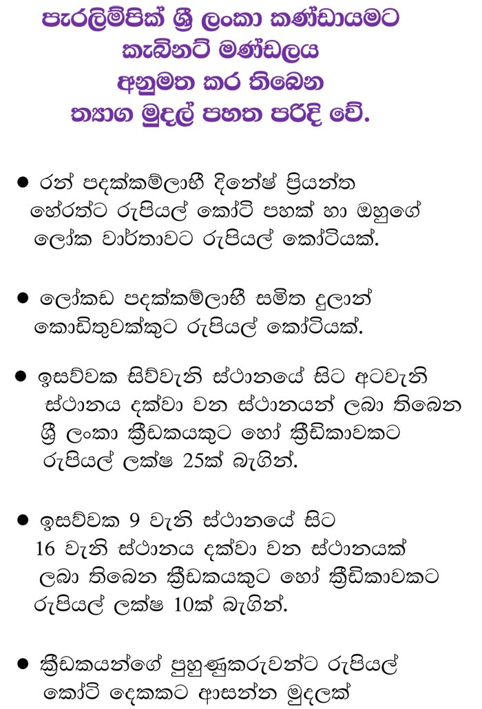 ටෝකියෝ ‘පැරලිම්පික්’ උළෙලේදී රන් පදක්කමක් දිනාගත් දිනේෂ් ප්රියන්ත හේරත් හා ලෝකඩ පදක්කමක් දිනාගත් සමිත දුලාන් හෙට්ටිආරච්චි ඇතුළු ශ්රී ලංකා කණ්ඩායම සඳහා රුපියල් කෝටි 10කට වැඩි (මිලියන 106 ක්) වන ත්යාග මුදලක් අනුමත කිරීමට කැබිනට් මණ්ඩලය අද (7) තීරණය කළේය. මෙම ප්රදානයන් යටතේ රන් පදක්කම්ලාභී දිනේෂ් ප්රියන්ත හේරත්ට රුපියල් කෝටි පහක ත්යාග මුදලක් අනුමත කර තිබේ. ලෝකඩ පදක්කම්ලාභී සමිත දුලාන්ට කැබිනට් මණ්ඩලයේ අනුමත වූ මුදල රුපියල් කෝටියකි.