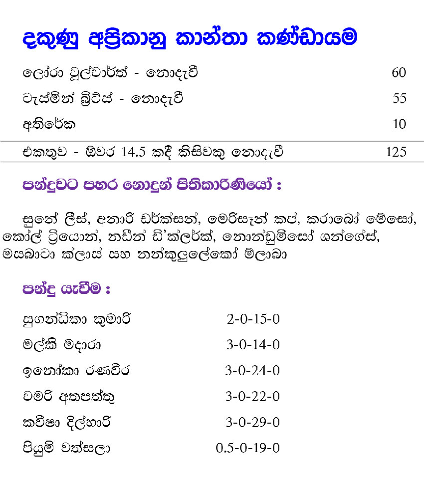 ඕවර 14.5 කදී කිසිවකු නොදැවී ලකුණු 125 ක් ලබාගත් දකුණු අප්‍රිකාව වෙනුවෙන් නායිකා ලෝරා වූල්වාර්ත් (නොදැවී 60) සහ ටැස්මින් බි්‍රට්ස් (නොදැවී 55) අලංකාර පිතිහරඹයක නිරත වූහ.