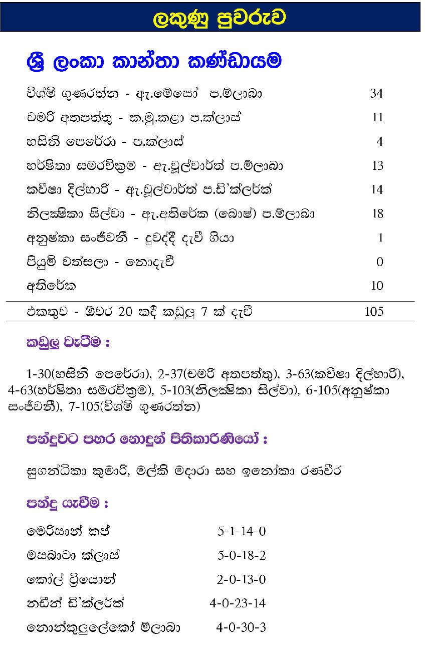 10 වැනි ඕවරය නිමාවේදී චමරි අතපත්තු ලකුණු 11 කට දැවී ගියාය. පන්දු 25 කට මුහුණ දී තිබූ ඇයගේ ඉනිමට ඇතුළත් වූයේ හතරේ පහර 2 ක් පමණි. පන්දු 18 කින් ලකුණු 6 ක් ලබා සිටි හර්ෂිතා සමරවික්‍රම සහ කවීෂා දිල්හාරි එක්ව ලකුණු සංඛ්‍යාව ඉදිරියට ගෙන යද්දී ඇතිවූ වර්ෂාව නිසා තරගය නතර කරන ලදි.
