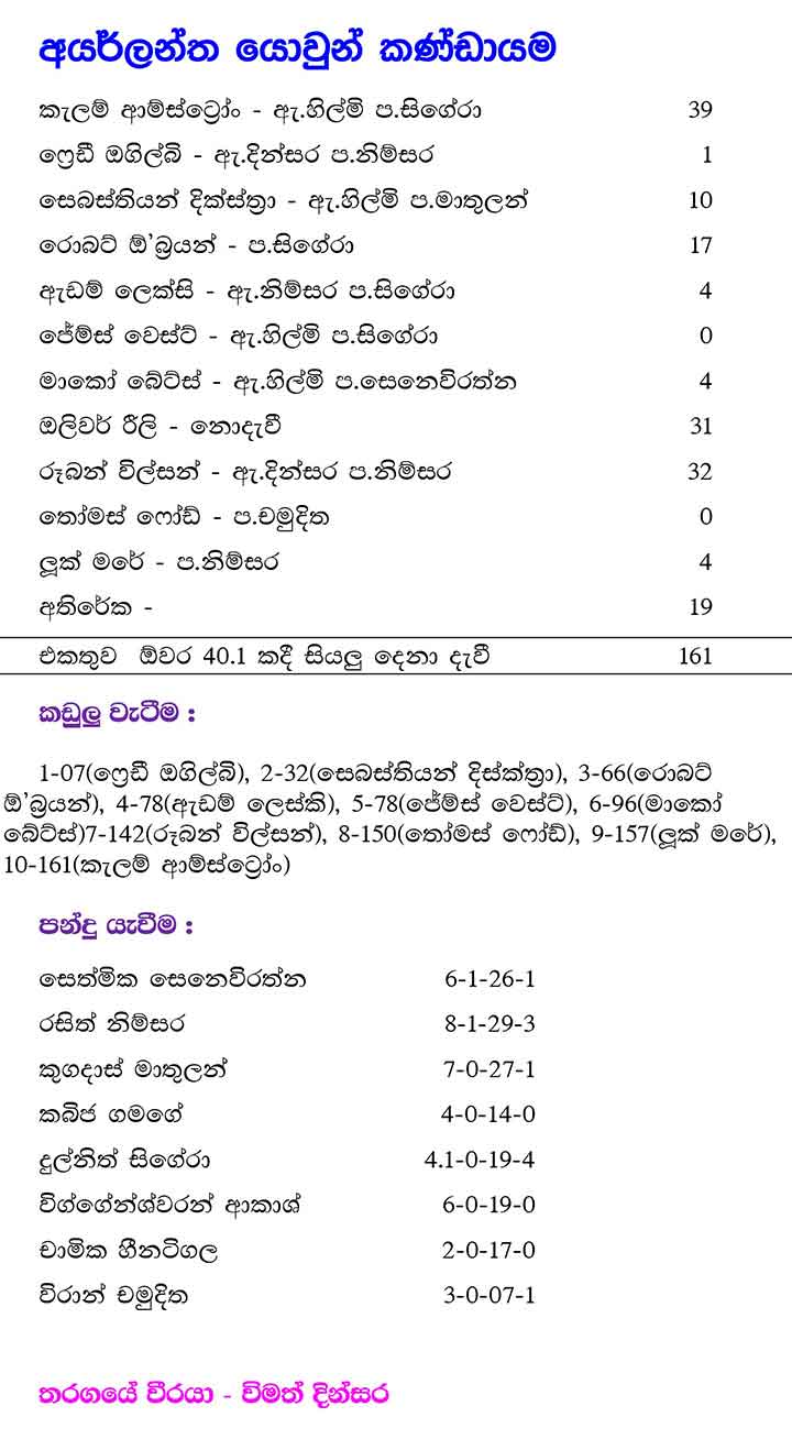 කාසියේ වාසිය දිනා පළමුවෙන් පන්දුවට පහර දීම තෝරාගත් නමුත් සෙනසුරාදා තරගයේදී ශතක ලබාගත් දිමන්ත මහවිතාන (09) සහ විරාන් චමුදිත (06) දෙදෙනාම ඕවර 4 ක් ඇතුළත දැවී ගියහ. දුල්නිත් සිගේරාට එක්වූ නායක විමත් දින්සර, ලකුණු සංඛ්යාව 59 ක් දක්වා ඇදගෙන යද්දී දුල්නිත් සිගේරා දැවී ගියේ අයර්ලන්ත පන්දු යවන්නන්ට තුන්වැනි කඩුල්ලත් තිළිණ කරමිනි.