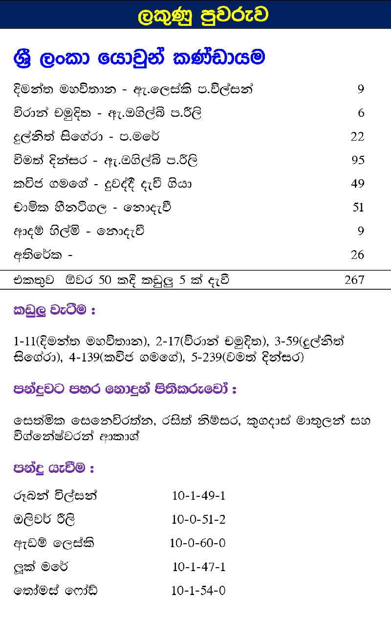 ඉතිරිව තිබූ ඕවර 4 න් ලකුණු 28 ක් උදුරාගත් චාමික හීනිගල සහ ආදම් හිල්මි 50 වැනි ඕවරය නිමාවන විට ලකුණු 267 ක් පුවරුවට එක්කර තිබිණ.