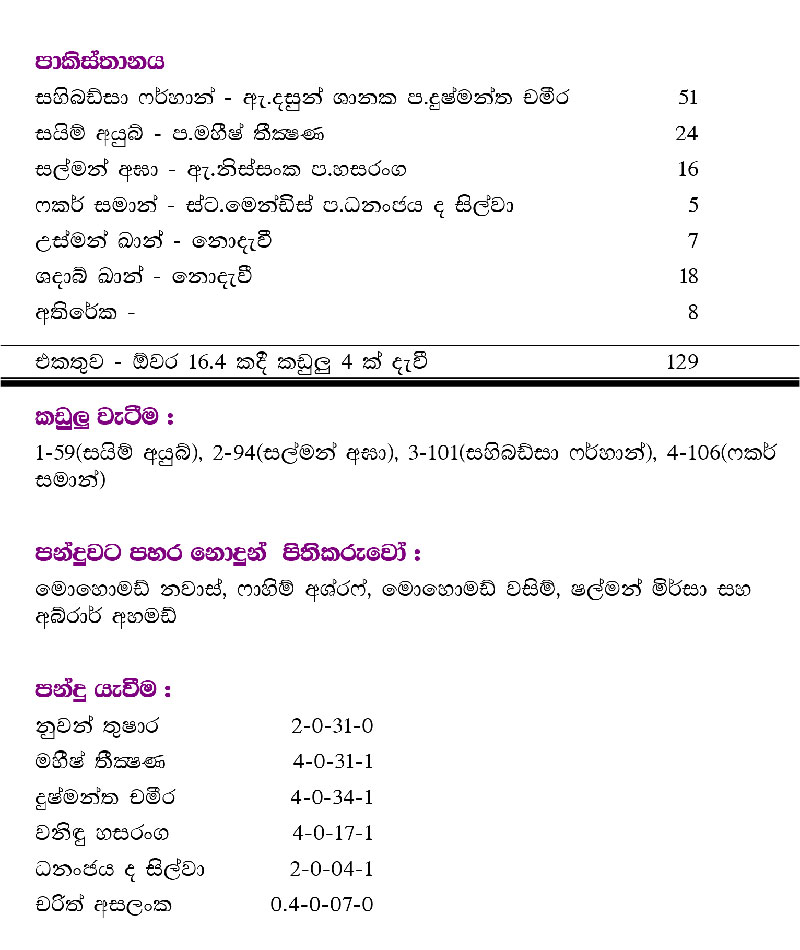 ශ්රී ලංකා පිතිකරුවන් මෙන් නොව, කිසිදු ආයාසයකින් තොරවම පන්දුවට පහර දුන් පාකිස්තානුවෝ හතරේ පහර 12 කින් සහ දැවැන්ත හයේ පහර 3 කින් තම ඉනිම අලංකාර කළහ. ශ්රී ලංකා නායක දසුන් ශානක පන්දු යවන්නන් 6 දෙනකු යොදවා ගත් නමුත් පාකිස්තානු පිතිකරුවන් මෙල්ල කිරීම පහසු නොවීය.