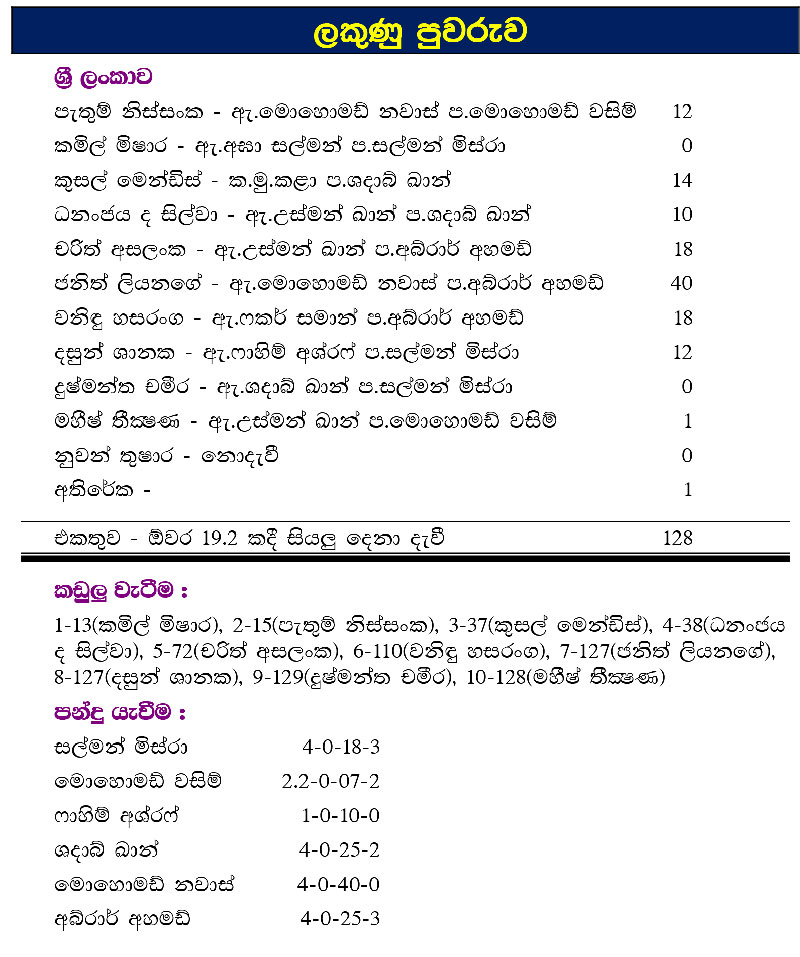 මුලින්ම පන්දුවට පහර දුන් ශ්රී ලංකා කණ්ඩායම ඕවර 19.2 කදී ලකුණු 128 කට දැවී ගියේය. කාසියේ වාසිය දිනාගත් පාකිස්තානු කණ්ඩායම පළමුවෙන් පන්දු යැවීම තෝරා ගත් අතර ජනිත් ලියනගේ ලබාගත් ලකුණු 40 හැරෙන්නට ශ්රී ලංකා පිලේ වෙනත් කිසිම ක්රීඩකයකුට ලකුණු 20 ක්වත් ලබාගත නොහැකි විය.