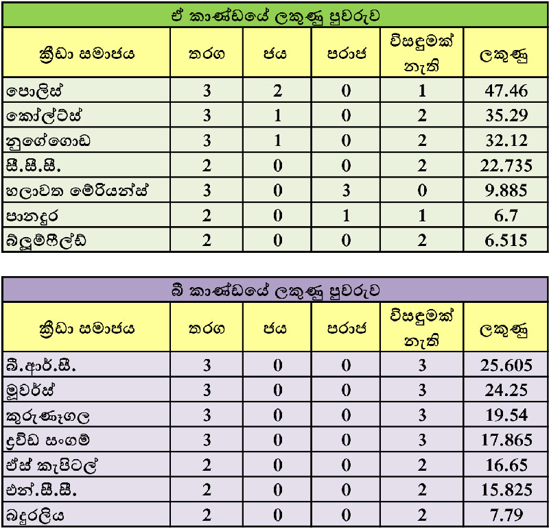 පළමු සතියේදී පානදුර කණ්ඩායමට එරෙහිව පූර්ණ ජයක් වාර්තා කළ පොලිස් ක්රීඩකයෝ දෙවැනි සතියේදී කෝල්ට්ස් කණ්ඩායමට එරෙහිව පළමු ඉනිමේ ජයක් වාර්තා කරමින් ‘ඒ’ කාණ්ඩයේ පෙරමුණට පැමිණියහ. තෙවැනි සතියේදී හලාවත මේරියන්ස් කණ්ඩායමට එරෙහිව පූර්ණ ජයක් ලබමින් ඔවුන් තවදුරටත් එම කාණ්ඩයේ පෙරමුණේ රැදී සිටියි.
