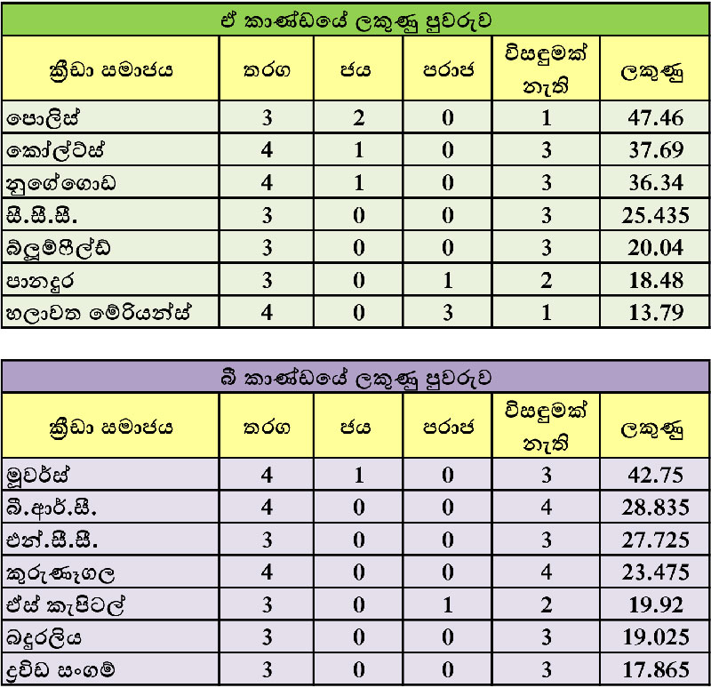 සිවුවැනි සතියෙදී කෝල්ට්ස් ක්රීඩා සමාජයට එරෙහිව පළමු ඉනිමේ ජයක් ලැබූ සී.සී.සී. කණ්ඩායම ලකුණු 37.69 ක් ලබා ‘ඒ’ කාණ්ඩයේ දෙවැනි ස්ථානයේ රැදී සිටියි. නුගේගොඩ කණ්ඩායම ‘ඒ’ කාණ්ඩයේ තෙවැනි ස්ථානයට පත්ව ඇත්තේ සිවුවැනි සතියේදී බ්ලූම්ෆීල්ඩ් කණ්ඩායම හමුවේ පළමු ඉනිමේ පරාජයක් ලබා ලකුණු 36.34 කට හිමිකම් කියමිනි.