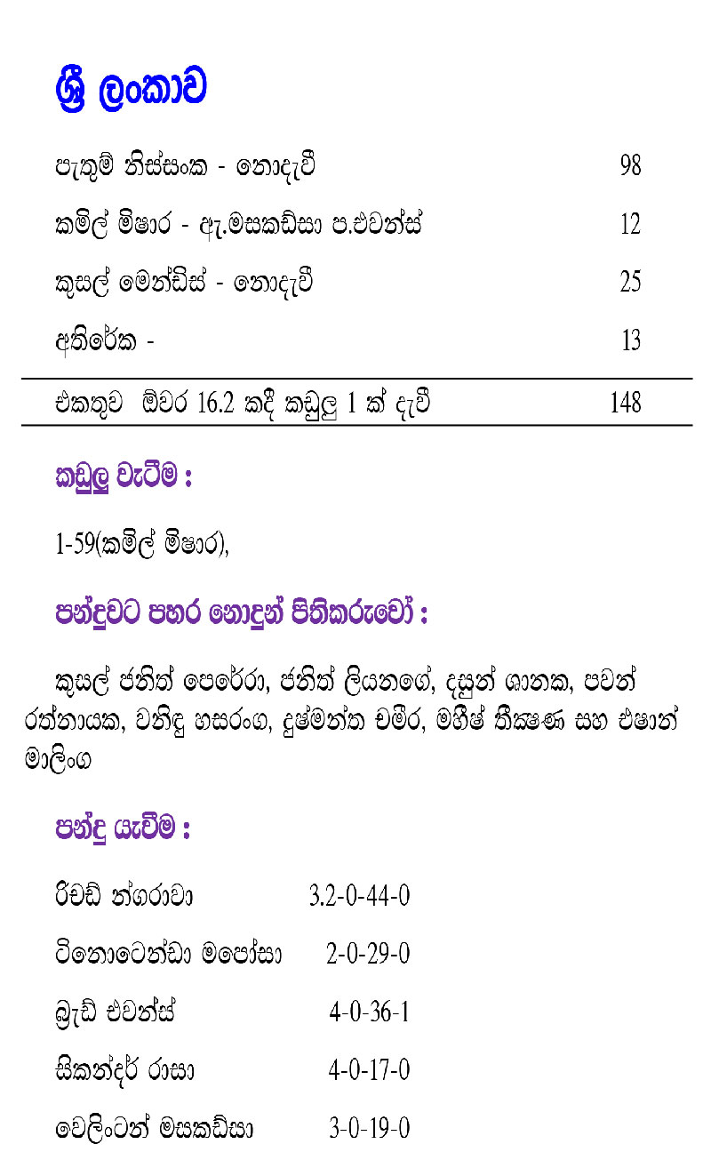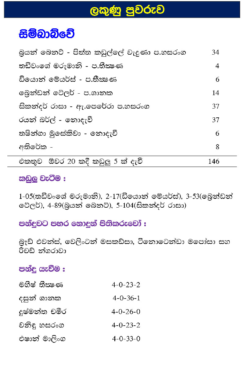 පළමුවෙන් පන්දුවට පහර දුන් සිම්බාබ්වේ පිතිකරුවෝ නියමිත ඕවර 20 නිමාවේදි කඩුලු 5 ක් දැවී ලබාගත්තේ ලකුණු 146 ක් පමණි. පැතුම් නිස්සංකගේ විශිෂ්ට පිතිහරඹය හමුවේ එය ඉතා පහසු ඉලක්කයක් වූ අතර නිස්සංක සහ කුසල් මෙන්ඩිස් දෙදෙනා පන්දු 22 ක් ඉතිරිව තිබියදී තරගය අවසන් කළහ.