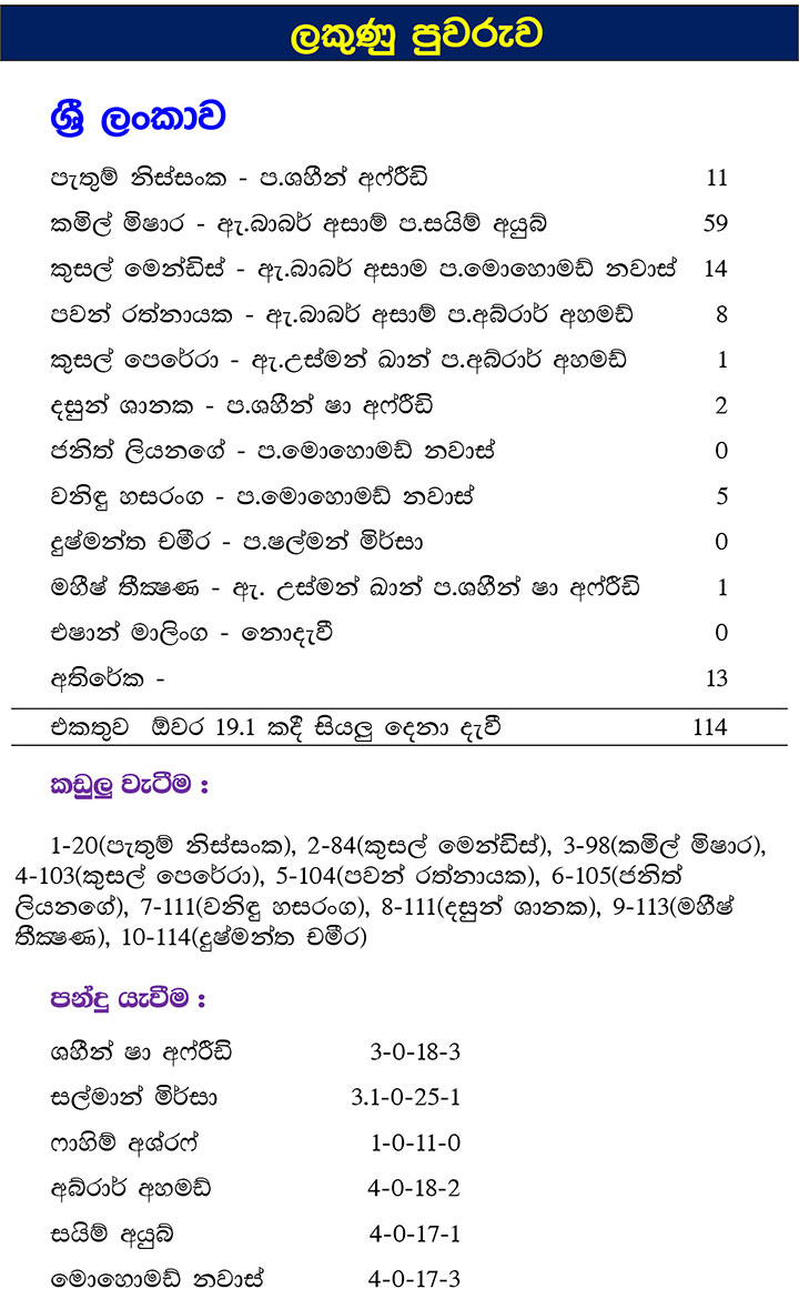 ආරම්භක පිතිකරු කමිල් මිෂාර සහ අංක 3 පිතිකරු කුසල් මෙන්ඩිස් එක්ව තමන්ගේ රාජකාරිය අකුරටම ඉටු කළහ. පැතුම් නිස්සංක ලකුණු 11 කට දැවී ගිය නමුත් පාකිස්තානු පන්දු යවන්නන් ගල ග්රහයෙන් ගත් කමිල් මිෂාර, මුහුණ දුන් 37 වැනි පන්දුවේදී සිය අර්ධ ශතකය සම්පූර්ණ කළේය. පන්දු යවන්නන් මට්ටු කිරීමේ අවසරය කමිල් මිෂාරට දුන් කුසල් මෙන්ඩිස් කණ්ඩායමේ කේන්ද්රීය ඉනිම ක්රීඩා කිරීමට සූදානමින් සිටියේය.
