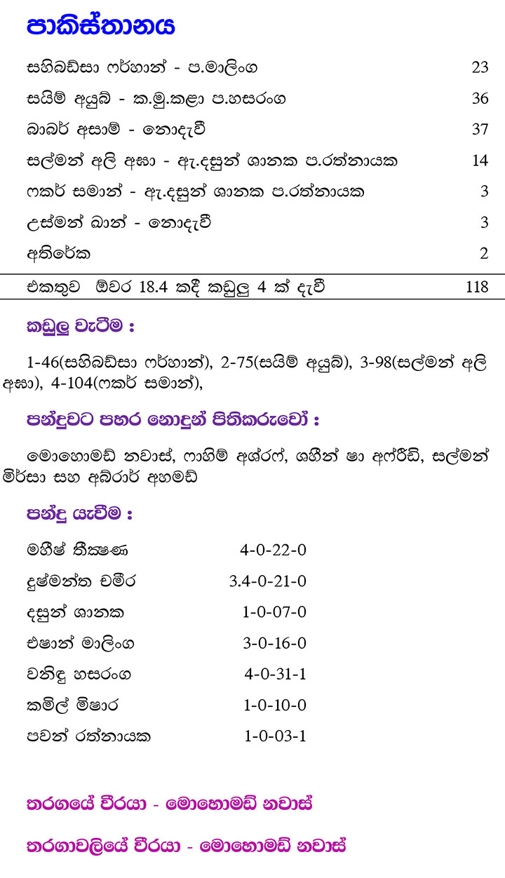 පිට පිටම පැවැති තරග දෙකකදී සිම්බාවේ පිලට එරෙහිව (148/1) සහ පාකිස්තානු කණ්ඩායමට එරෙහිව (184/5) සාර්ථක පිතිහරඹයක නිරත වූ ශ්රී ලංකා කණ්ඩායම ඒ ක්රීඩාංගණයේදීම ලකුණු 30 කට කඩුලු 9 ක් අහිමිකර ගැනීම ඇදහිය නොහැක්කකි.