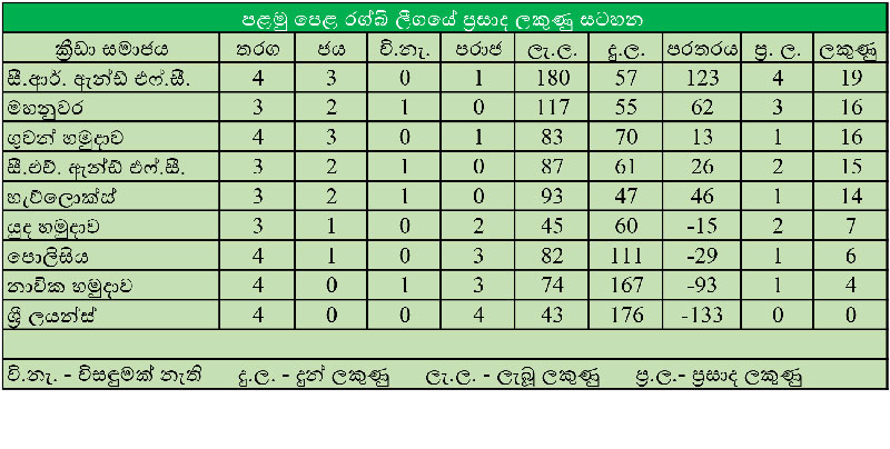 ශ්‍රී ලංකා රග්බි සංගමය සංවිධානය කරන අන්තර් සමාජ පළමු පෙළ (2025-26) රග්බි ලීගයේ හයවැනි සතිය නිමාවට පත්වන විට ලකුණු 19 ක් ලබා යළිත් ප්‍රසාද ලකුණු සටහනේ පෙරමුණට පැමිණීමට සී.ආර්. ඇන්ඩ් එෆ්.සී. ක්‍රීඩා සමාජය සමත්ව සිටියි. මේ වන විට ඔවුන් ලබා සිටින ප්‍රසාද ලකුණු සංඛ්‍යාව 4 කි.