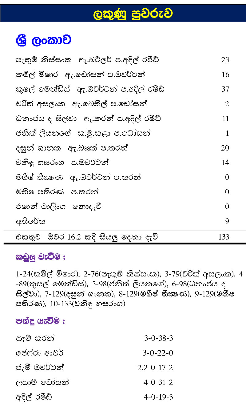 සුන්දර සිහිනයක් ලෙසින් ආරම්භ වූ ශ්රී ලංකා ඉනිම අවසන් වූයේ මහත් භයංකාර විලාසයෙනි. පැතුම් නිස්සංක (23) සහ කුසල් මෙන්ඩිස් (37) දෙදෙනා එක්ව 7 වැනි ඕවරය නිමාවේදී ලකුණු 75 ක් පුවරුවට දැමූහ. එහෙත් පැතුම් නිස්සංක දැවී යාමත් සමගම ලකුණු 57 ක් ඇතුළත කඩුලු 9 ක් බිඳ වැටිණ. ශ්රී ලංකා කණ්ඩායමේ දුර්වලතාව ඇත්තේ මැද පෙළ පිතිහරඹයේ යන්න නැවත වරක් කදිමට විද්යමාන විය.