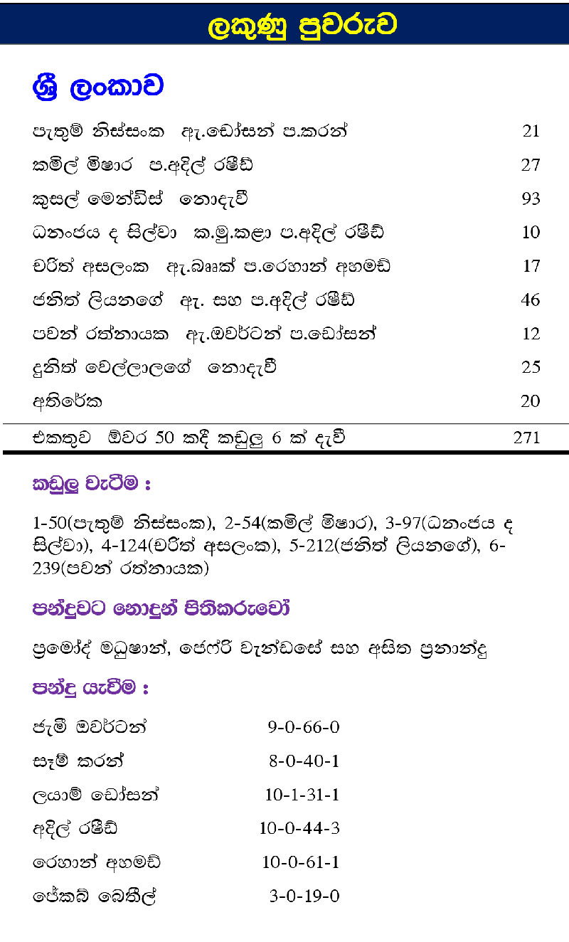 ඉතිරි පන්දු 4 න් තුනක්ම අලංකාර පහර තුනකින්, හතරේ සීමාවෙන් එපිටට යැවූ වමත් පිතිකරුවා අවසන් පන්දුවෙන් තවත් ලකුණු 02 ක් ලබාගත්තේ කණ්ඩායමේ ලකුණු සංඛ්‍යාව 270 න් ඔබ්බට ගෙන යමිනි.