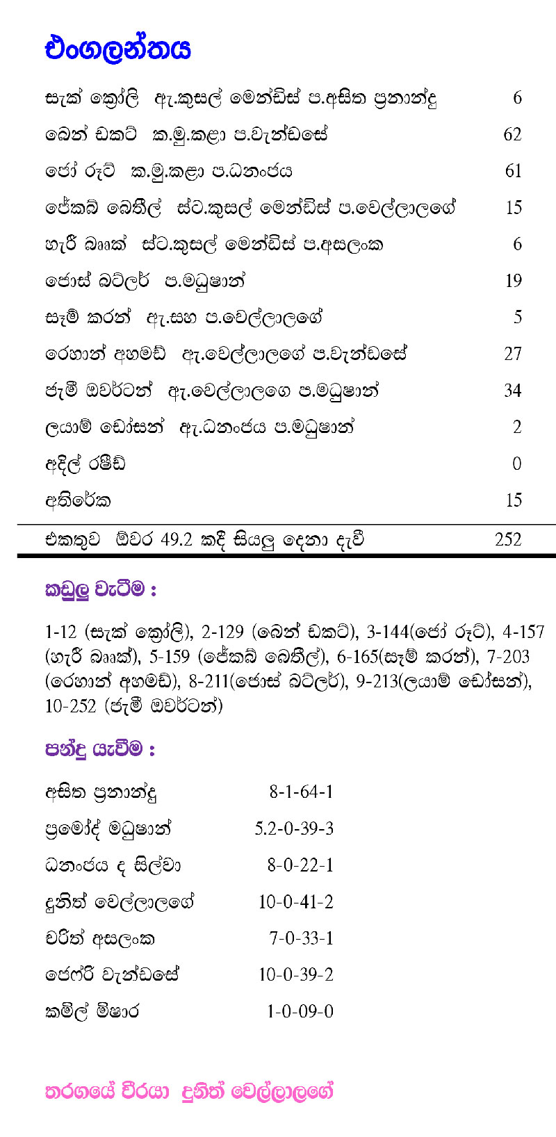 වසර දෙකට පසුව එක්දින පිටියට පා තැබූ ධනංජය ද සිල්වා (22/1) සහ දුනිත් වෙල්ලාලගේ (41/2) දෙදෙනාගේ අති විශිෂ්ට පන්දු යැවීමක්, කුසල් මෙන්ඩිස්ගේ පිතිහරඹයත් (93) නිසා කොළඹ ආර්. ප්‍රේමදාස ක්‍රීඩාංගණයේදී අද (22 වැනිදා) පැවැති පළමු එක්දින තරගයේදී ශ්‍රී ලංකා ක්‍රීඩකයෝ ලකුණු 19 ක ජයක් අත්කර ගත්හ. ලකුණු 272 ක ඉලක්කයක් කරා ගිය එංගලන්ත කණ්ඩායමට ඕවර 49.2 ක් අවසානයේදී ලබාගත හැකිවූයේ ලකුණු 252 කි.